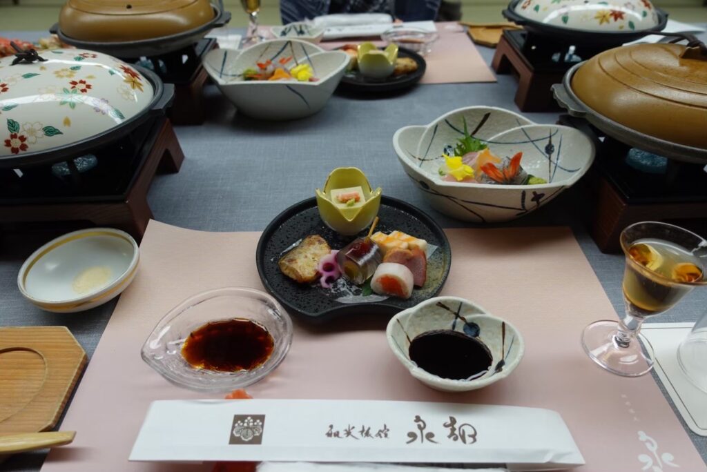 冬の城崎といえばカニ料理。刺身・焼きガニ・カニすきまで盛り込まれた豪華なコースに加え、但馬牛ステーキも登場。日本海と但馬の幸を同時に味わえる贅沢な夕食でした。