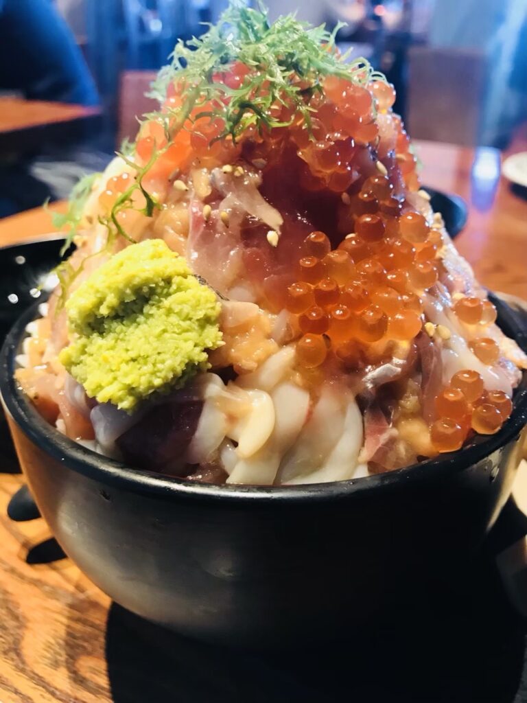 マグロ、イクラ、ウニなど新鮮なネタが山のように盛られ、圧倒される豪快さ。