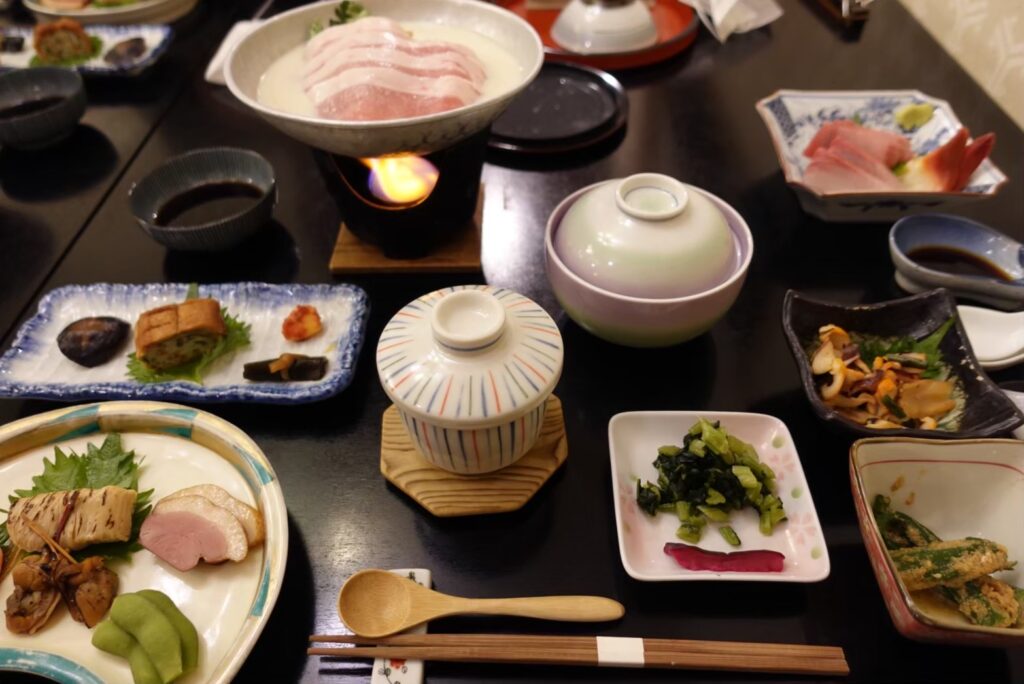 草津の中心・湯畑そばに建つ宿。純和風の落ち着いた雰囲気で、湯めぐりや街歩きに便利。夕食はもち豚の豆乳鍋がメインで、やさしい味わいに心も体も癒やされました。