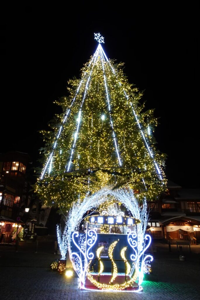 名湯・草津温泉を象徴する湯畑ライトアップに加え、クリスマスイブならではのツリーの光景が特別感を演出。