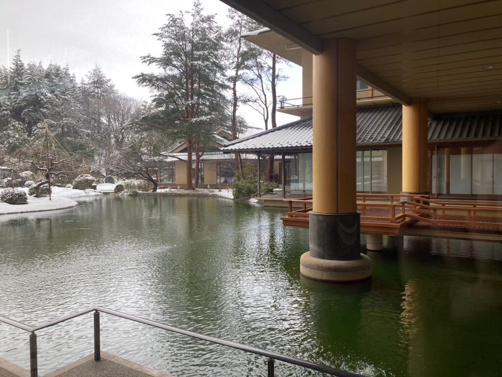 広大な日本庭園を望む大浴場と露天風呂。残雪の庭と翡翠色の湯のコントラストが忘れられません。