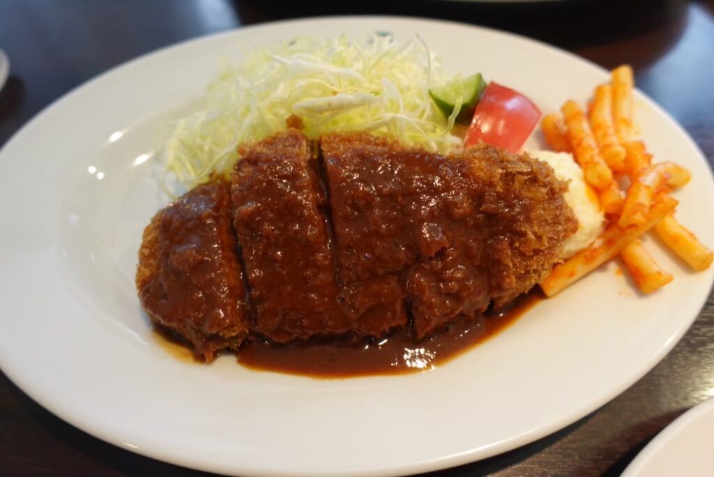 衣を切ると肉汁があふれ、濃厚なデミグラスソースが立ち上ります。厚切り肉は驚くほど柔らかく、噛むたびに旨味が広がり幸福感が増す一皿。