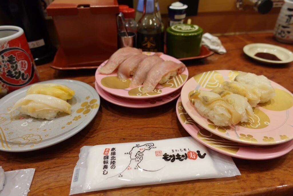 新鮮な魚介がずらりと並び、活気あふれる市場。カニや甘エビを試食しながら歩くだけで楽しい。ランチの「もりもり寿し」では豪快なネタが乗った寿司を堪能しました。