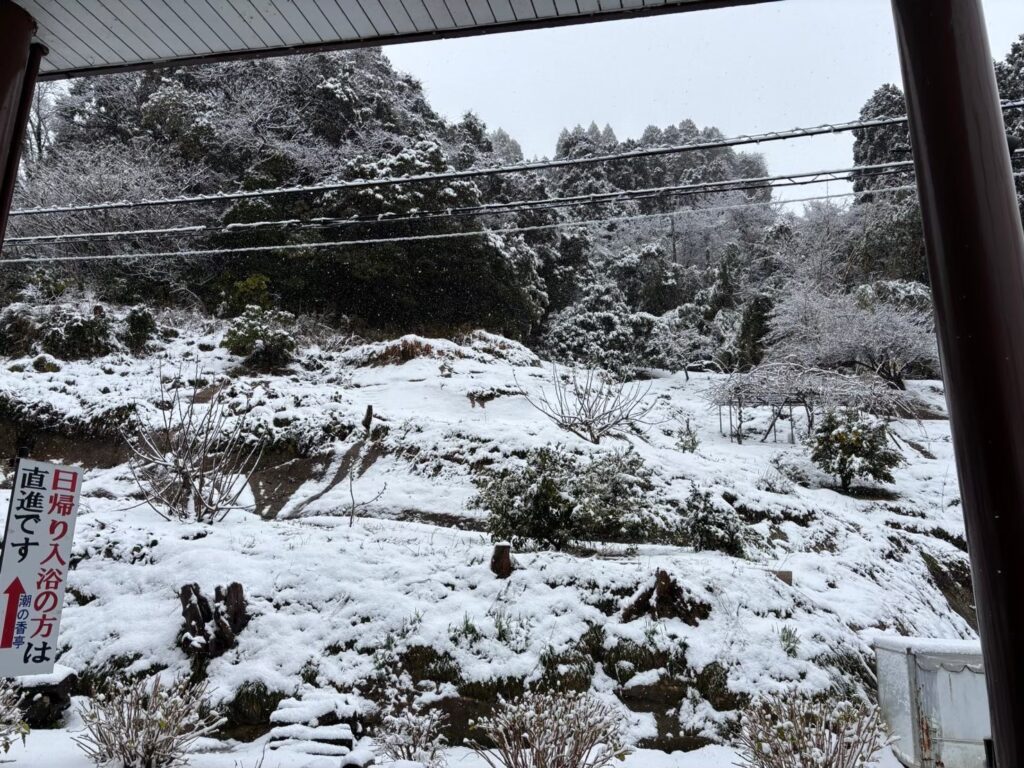 宿に到着すると、日本海を一望できるロビーが迎えてくれました。チェックインを済ませ、いざ温泉へ。寒ブリの季節なので、あたり一面雪景色でした。