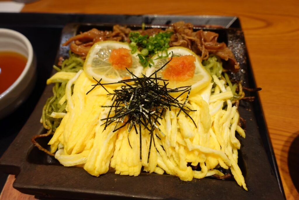 翌日の昼食には山口名物の瓦そば。アツアツの瓦にのった茶そばがパリッと焼け、牛肉の甘辛さと錦糸卵が重なって絶妙な味わい。
