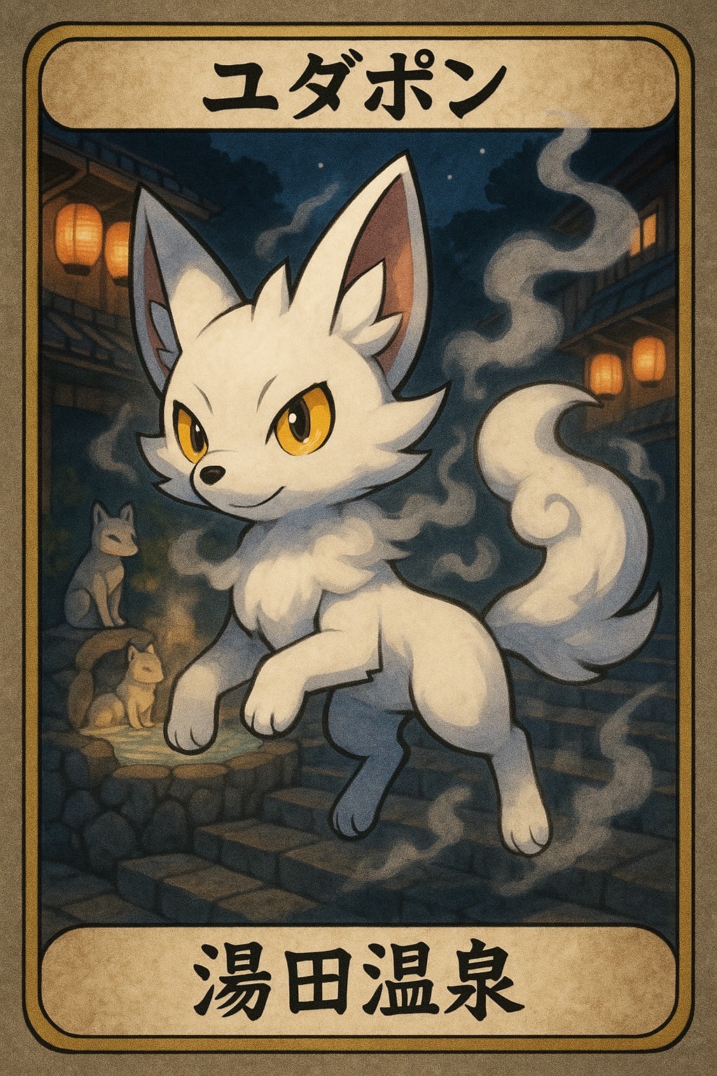 純白の毛並みと金色の瞳を持ち、夜の温泉街を湯けむりとともに駆け抜ける。