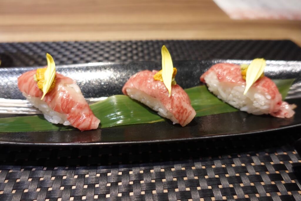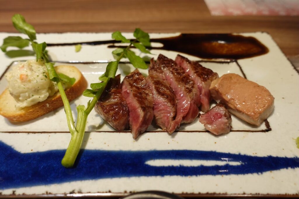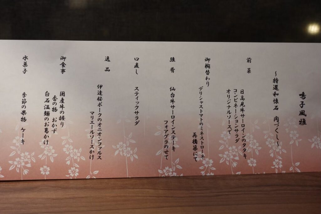肉づくしの和懐石。おしゃれな盛り付けでどれも美味しかったです!特に仙台牛サーロインステーキは、肉の旨みがしっかりしていて、メインディッシュに相応しい1品でした。